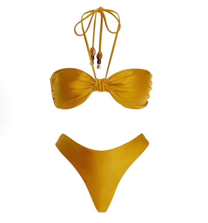 Agua by Agua Bendita’s ‘Vera’ bikini features playful ruffled edges and a bold leopard print. Crafted from stretchy recycled fabric, they provide moderate coverage. Perfect for an afternoon of margaritas at a beach club.