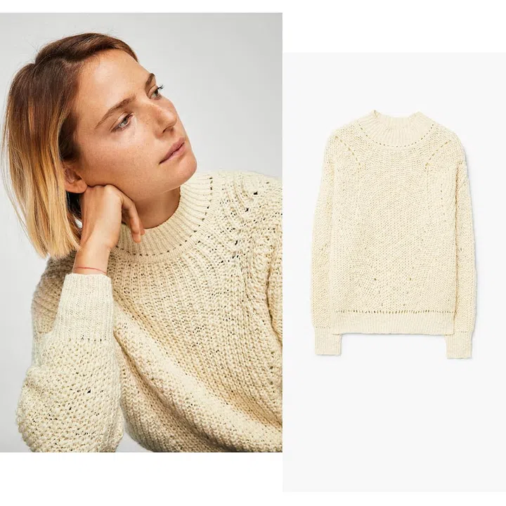 To keep you warm, this sweater has a high-neck collar and cable knit finish. At the same time, it’s 100% cotton composition means it’s lightweight enough to carry around with you all day.