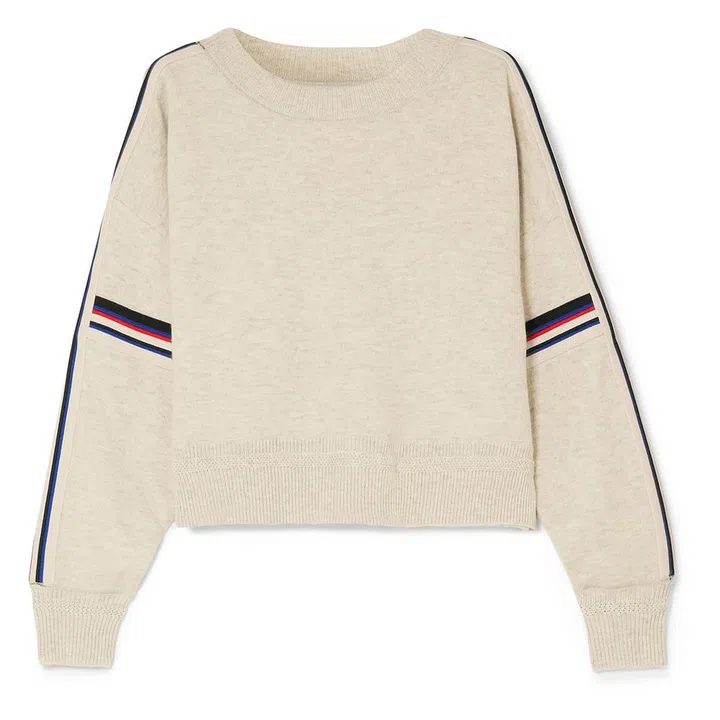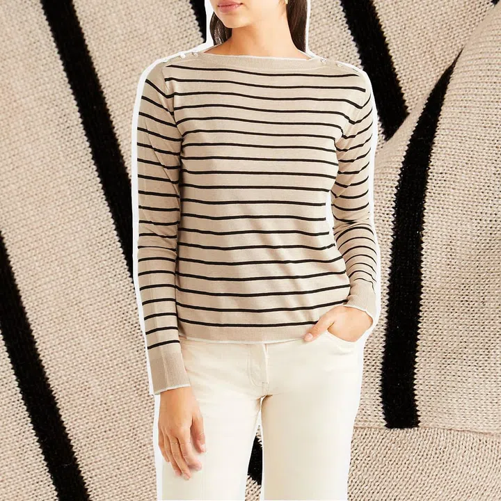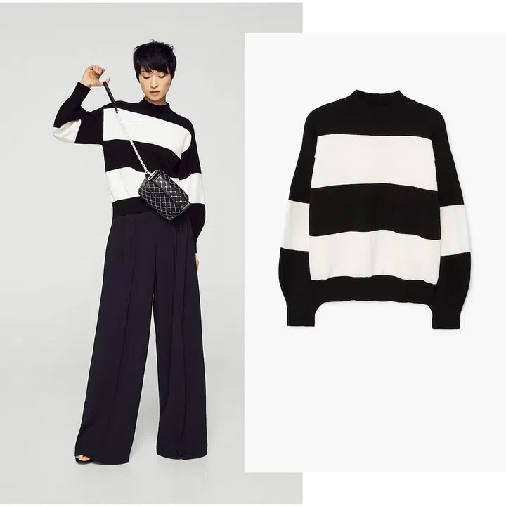 Stripes are always a great element to style up your outfit. Thankfully, this sweater also works to keep you warm without having to worry about looking oversized – it has a loose fit, puffed sleeves and elastic cuffs.