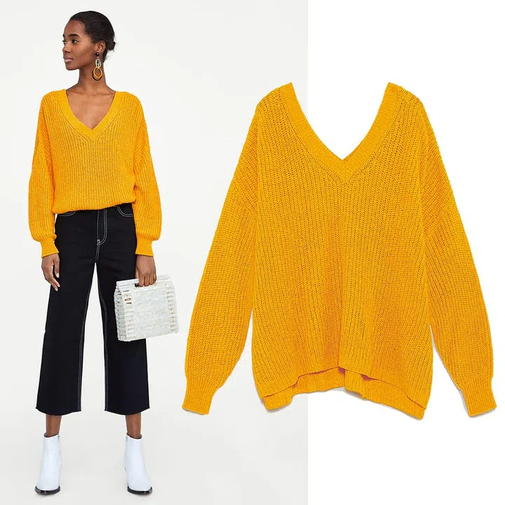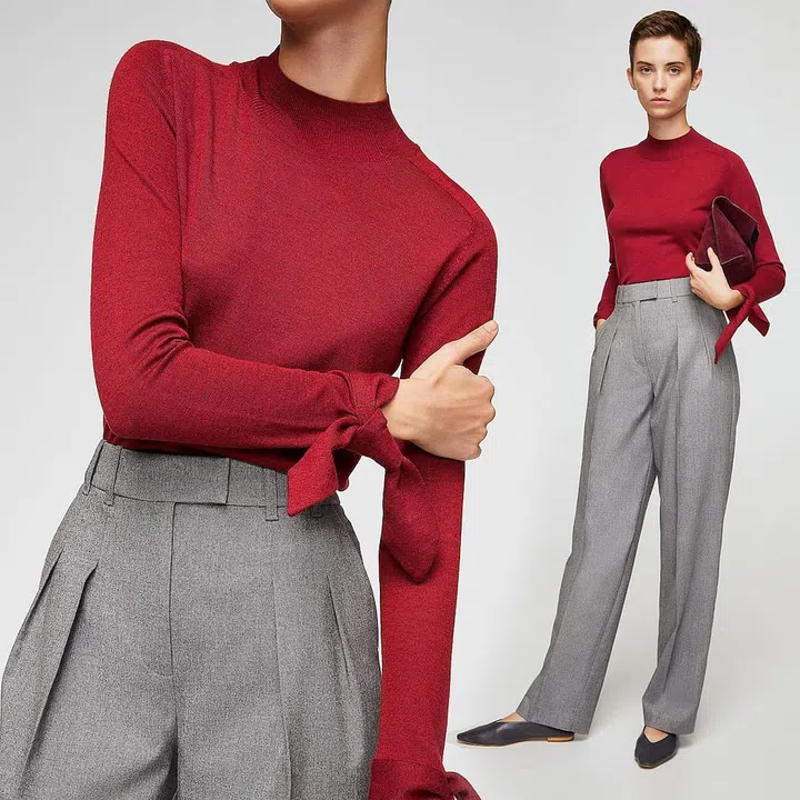 You don’t have to shy away in the office thanks to the decorative knots on this sweater’s sleeves (which we’re totally loving). Plus it’s knitted, high collar and ultra-lightweight. You could even wear it (in grey or black too) by itself!
