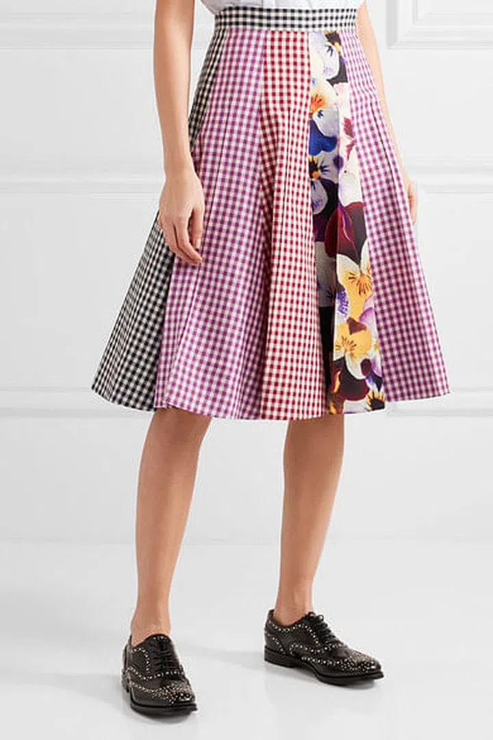 Reworking some of his most iconic pieces and prints, Christopher Kane’s A-line skirt is crafted from a patchwork of gingham twill. We love the spliced detail of pansy-printed satin panel (a defining motif of the collection), lending a soft ladylike look to it.