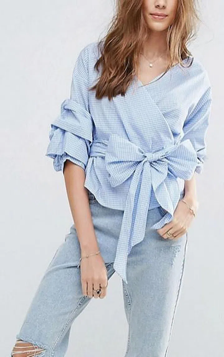 Wrap front blouses are all the rage and when coupled with gingham, it just checks off the right boxes. We love the ruffle-detailed sleeves, adding extra volume to the overall look. Wear yours with a pair of equally soft pastel culottes and heeled loafers for work.