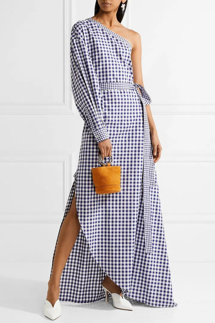 Rosetta Getty one-shoulder gingham cotton wrap gown, $1,130 from Net-a-porter