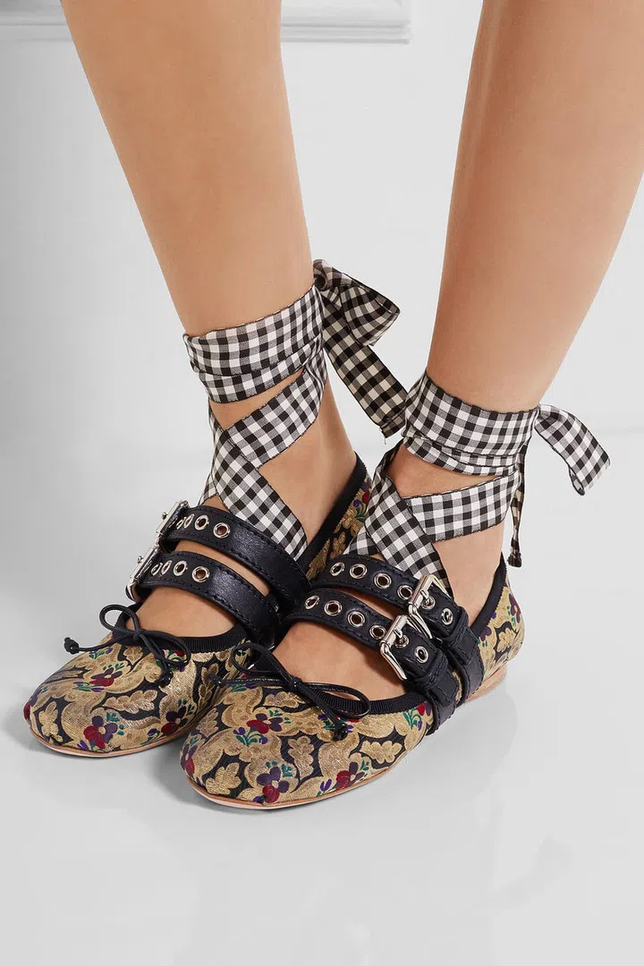 Miu Miu lace-up leather-trimmed brocade ballet flats, $842 from Net-a-porter