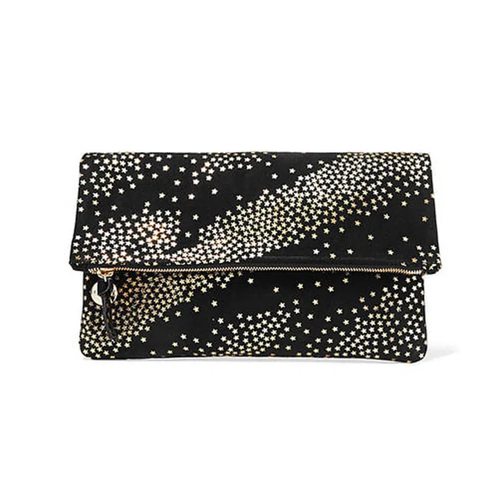 This casual foldover clutch screams “it’s going to be a good night” with its multitude of gold stars and comfortable-t0-hold black suede. Exclusively available on Net-a-Porter.