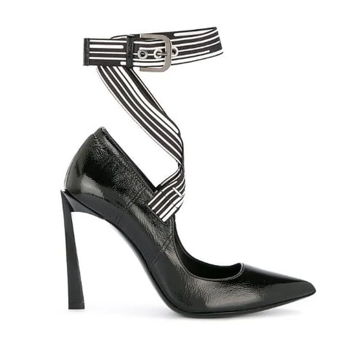 A pair of black heels is a wardrobe staple. Instead of choosing a ho-hum pair in just calf leather, turn it up a notch with something that’s more exciting. These Lanvin pumps sport a bold ankle strap that will add a touch of personality to a skirt-suit ensemble.