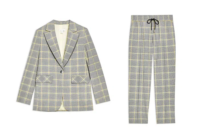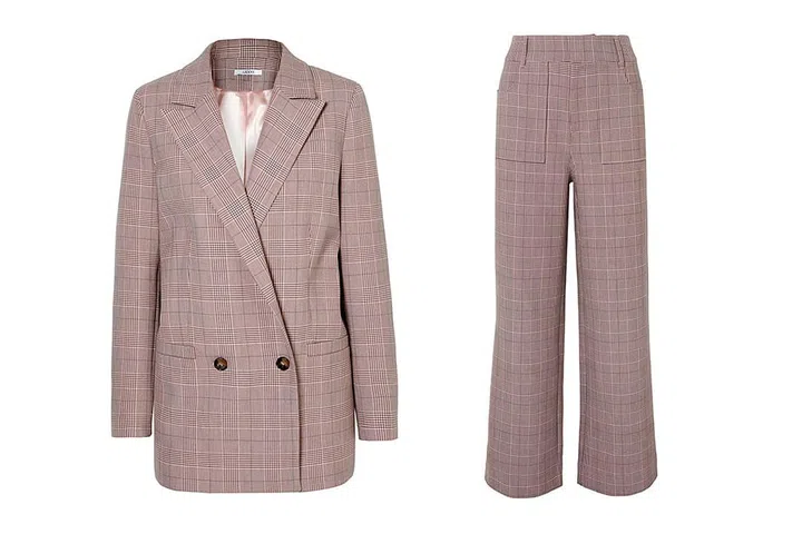 Ganni checkered cady blazer and straight leg pants, £280 (S$486) and £200 (S$347), both from Net-a-Porter