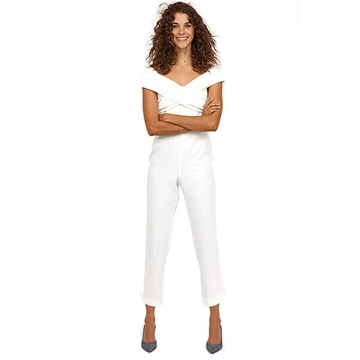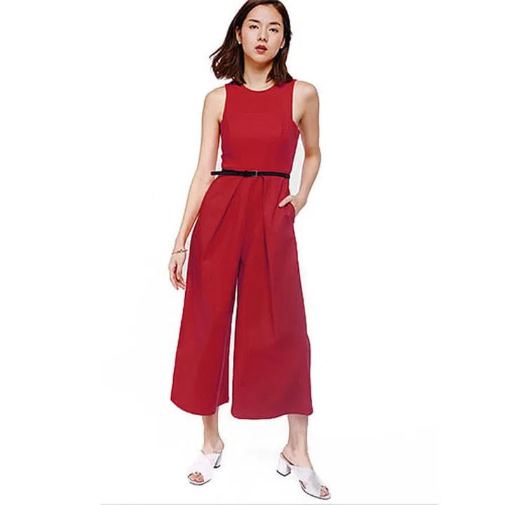 Stand out with one that’s in a bright red hue. This piece is has extra sass because of its wide-legged cropped legs. Since the shade is striking enough, tame it down with a black blazer and a pair of nude ballerina flats.
