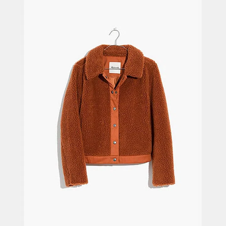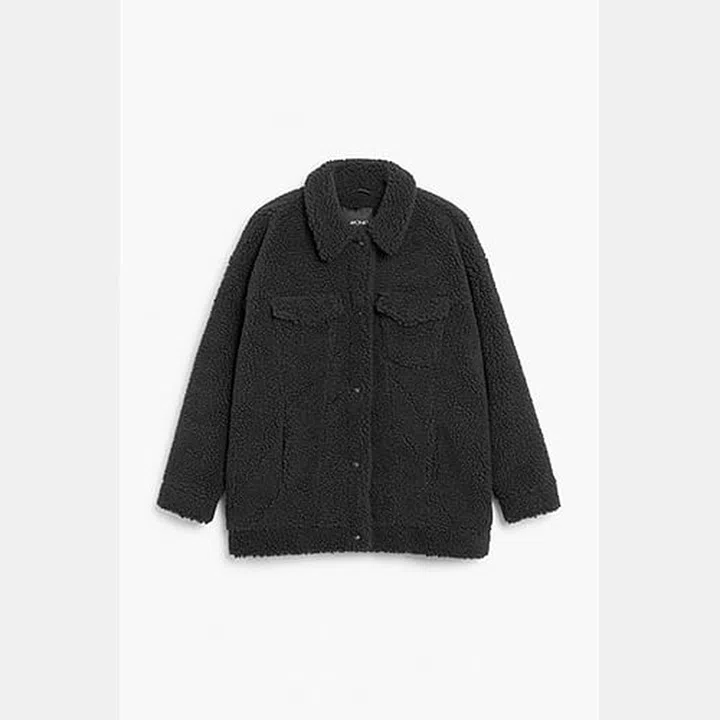 Try making a statement by layering this casual, faux fur utility jacket on top of a denim jacket of a similar style. Finish the look with a pair of wide-leg wool trousers and a faux leather shirt.