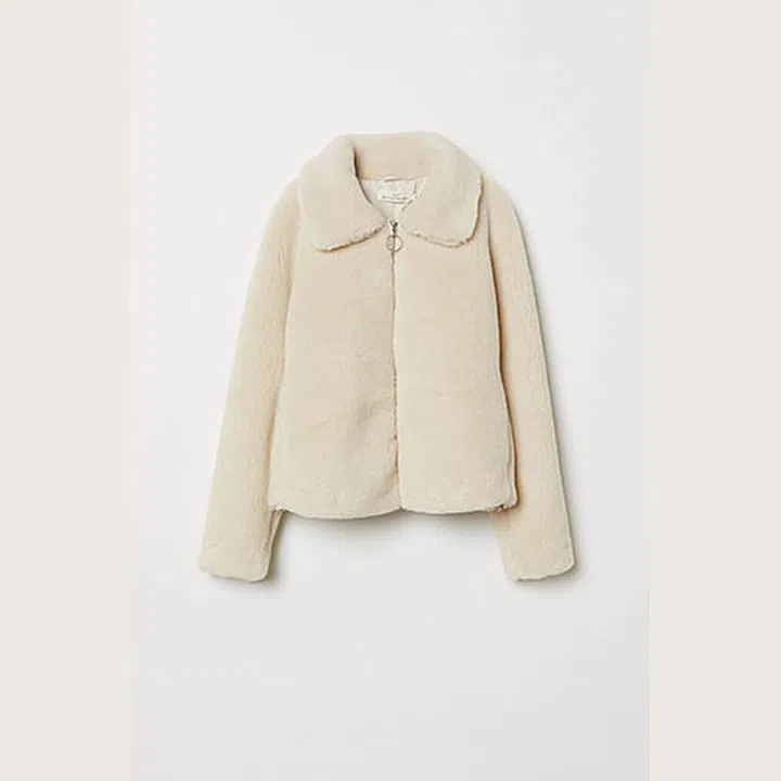 This cream coloured faux fur biker jacket will be a perfect alternative to a camel wool coat. We like that it’s edgy yet in a feminine shade. Dress it up with a pleated wool dress and a pair of thigh-high leather boots.