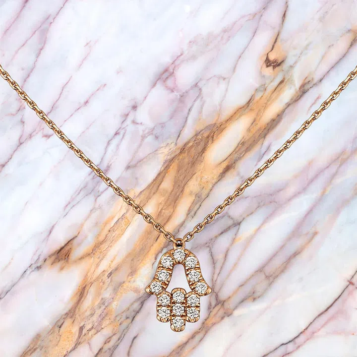 The hamsa (or Hand of Fatima), featured on the pendant, is a palm-shaped amulet known for its symbol of protection and defence against the evil eye.