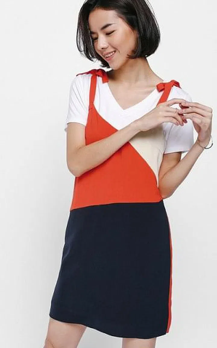 If you aren’t used to wearing bright colours on a daily basis, try this shift dress with a pop of red. Wear it alone or pair it with a white crop tee inside to pull off the Korean look.