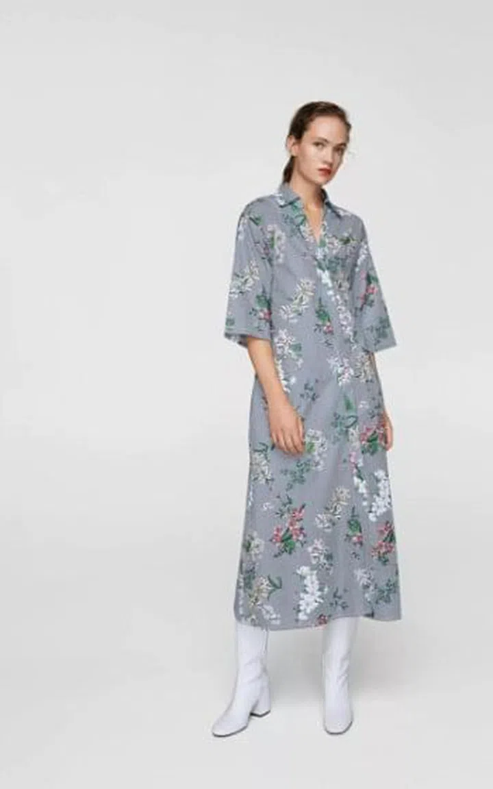 Mixing and matching prints has never been easier. This shirt dress which combines both a subtle stripe and pastel floral print together is loose fitting as well. That means no bloated belly showing through.