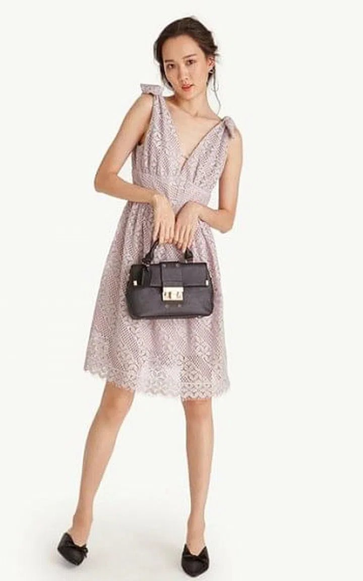 Despite having a plunging neckline, this sultry number is balanced out by the delicate bows on the straps and the dusty purple colour.