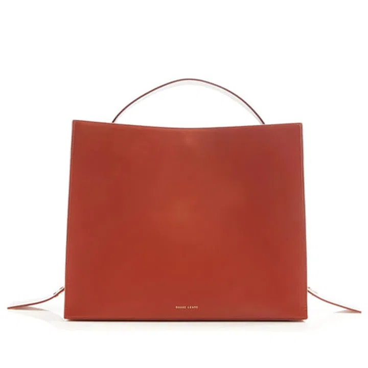 This oversized tote bag is rendered in a gorgeous bright terracotta red. It also features a contrasting white chunky handle with gold hardware running down the sides. This is the perfect work bag given its roomy interior.