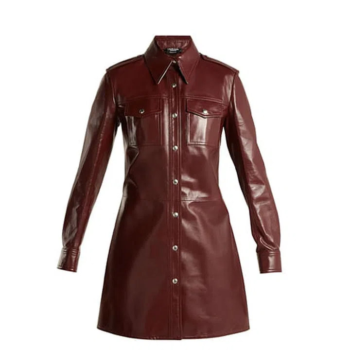 Lean into the all-western trend with this burgundy leather shirtdress that features two front patch pockets and a slim silhouette.