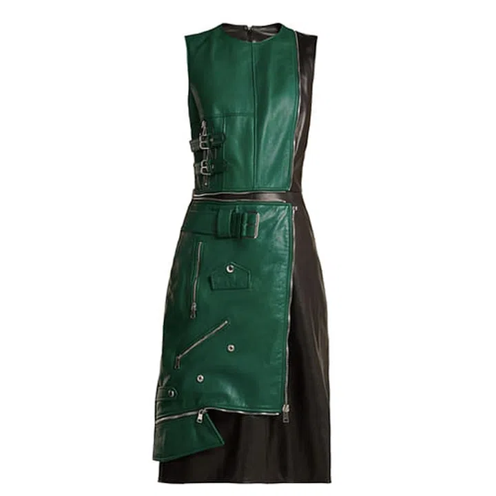 As seen on Sarah Burton’s F/W ‘18 show for Alexander McQueen, this emerald green and black panelled leather dress was inspired by the look of a deconstructed biker jacket.