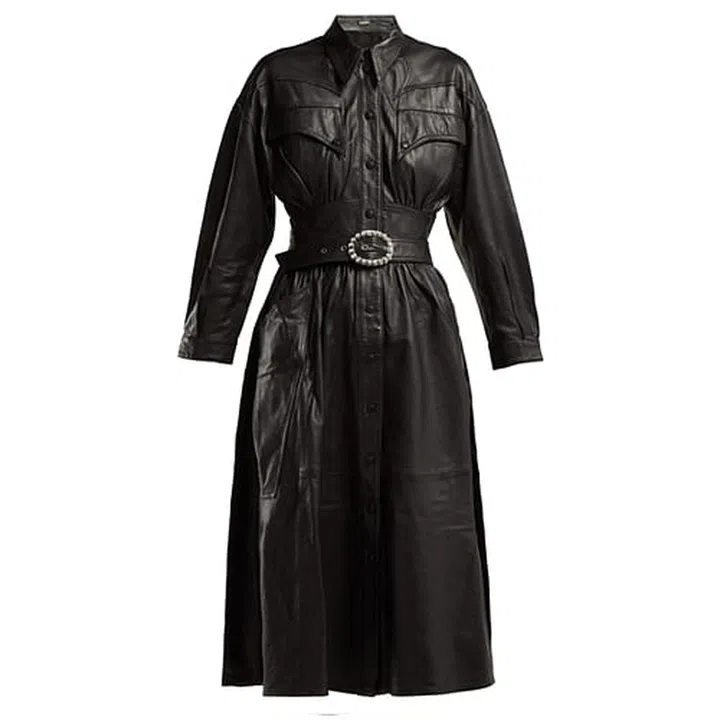 Featuring a decorative belt with faux jewels encrusted on the buckle, western-inspired gun flap pockets, and a voluminous pencil skirt, this 100% leather dress is a staple that makes for a great everyday look.