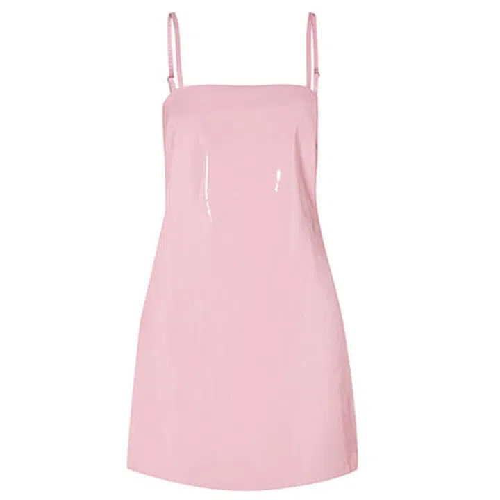 Made from patent faux leather in a stunning milky pink shade, this mini dress boasts of a retro appeal with its square neckline and chic slip dress silhouette.