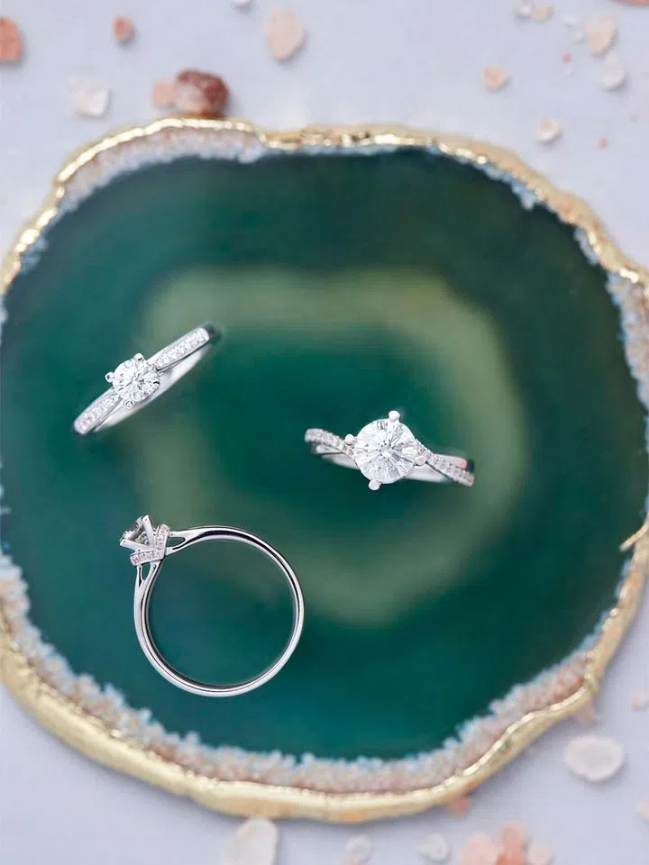 From left: Brilliant Rose 18K white gold engagement ring with diamond solitaire, and True Love 18K white gold engagement rings with diamond solitaires, SOO KEE JEWELLERY.