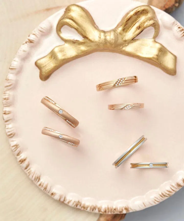(Top and middle) Lorraine Z 18K rose gold wedding bands with diamonds, and (bottom) Embrasser platinum and 18K gold wedding bands with and without diamonds, SOO KEE JEWELLERY.