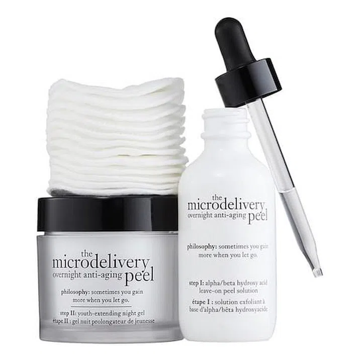 An anti-aging peel that combines the immediate micro-exfoliation of a peel with the restorative benefits of an overnight sleep mask. It has two steps, the first is a resurfacing peel solution, then you layer on an overnight gel that functions like a replenishing mask. Together they help to diminish the look of wrinkles and pores and brighten the complexion too.