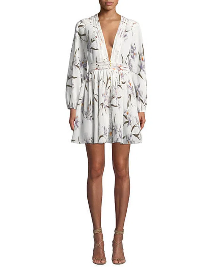 Zimmermann Corsage Floral Plisse Long-Sleeve Mini Dress, SGD $1,113.40, from Neiman Marcus.