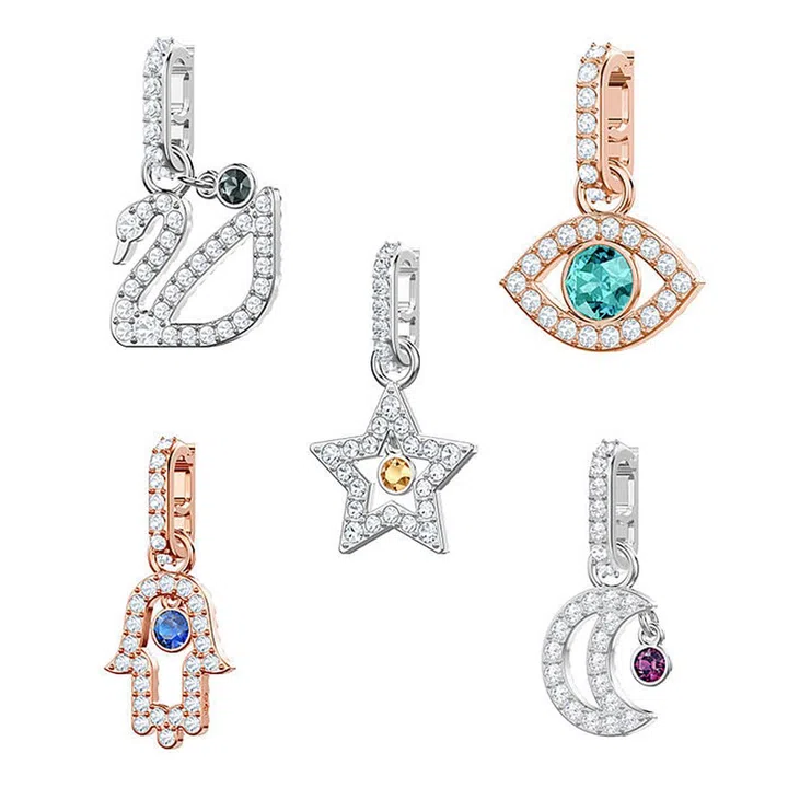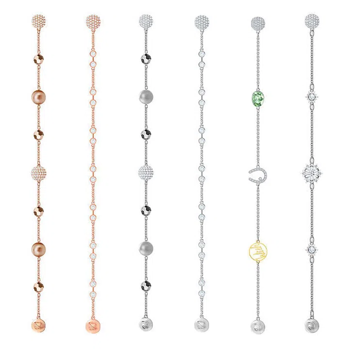 FROM LEFT: SWAROVSKI REMIX COLLECTION STRAND MX ROSE GOLD, $149; SWAROVSKI REMIX COLLECTION STRAND CARRIER ROSE GOLD, $79; SWAROVSKI REMIX COLLECTION STRAND MX RHODIUM, $149; SWAROVSKI REMIX COLLECTION STRAND CARRIER RHODIUM, $79; SWAROVSKI REMIX COLLECTION STRAND WISH, $149; SWAROVSKI REMIX COLLECTION STRAND SNOWFLAKE, $149