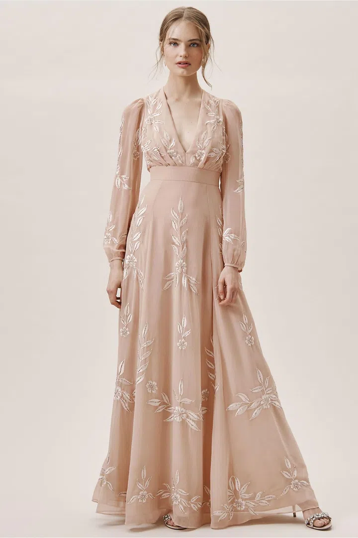 If you fell in love with the long-sleeved, billowy skirt look that the Passenger star had on but wished it came with a little more detailing, this dress is it.