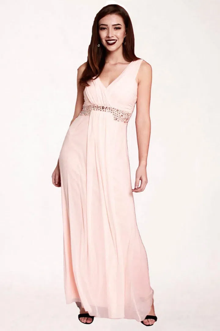 Glittering rhinestones jazz up this Grecian-style dress for a touch of glamour.
