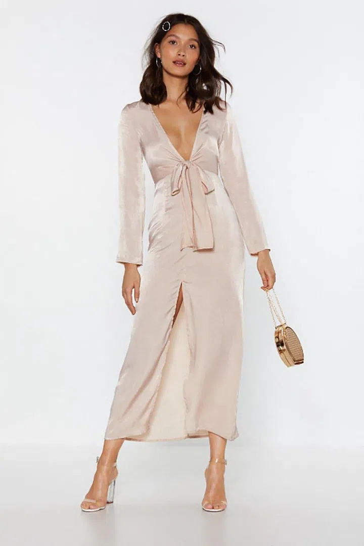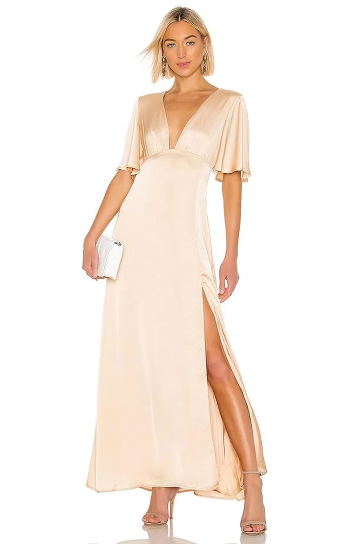 If you're someone who likes things simple with a little sultry, you'll love this flowy champagne-hued satin dress with a thigh-high slit - elegant for both day and night.