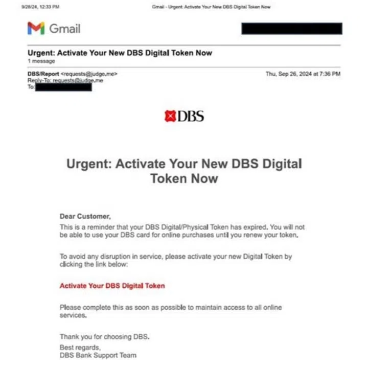 Victims would receive an e-mail or text message supposedly from DBS urging them to click on an embedded online link to resolve an urgent issue