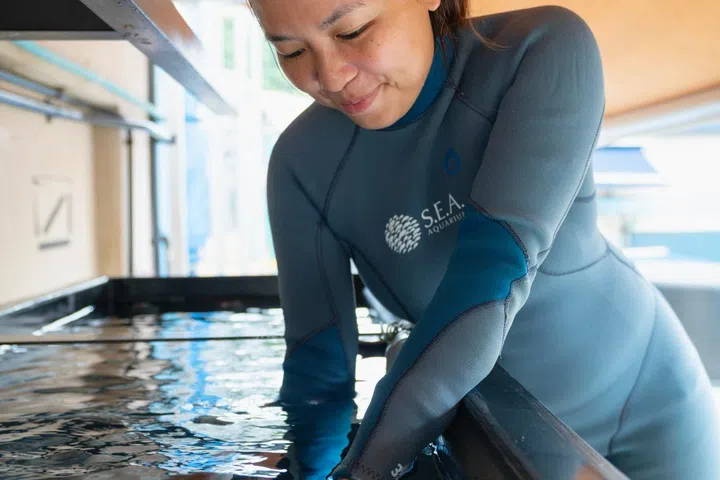 Her love for animals and the sacrifices made by her loved ones paved the way for her fulfilling career as an aquarist at S.E.A. Aquarium. Over nine years, Beverly has cared for everything from newborn and unwell animals in quarantine to the majestic sharks and manta rays in the aquarium’s largest habitats.