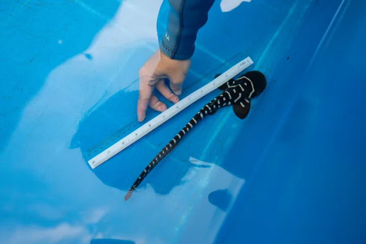 Beverly: Yes, working with zebra shark eggs can be quite challenging. Out of all the eggs produced, only about 30% are fertilised, and of that percentage, just 20% of the pups inside manage to hatch on their own. If a pup hasn’t emerged after its yolk sac is depleted, we perform assisted hatching, a delicate process to manually open the egg case. It’s usually not something done in the wild, but given that zebra sharks are endangered, we take every possible step to ensure their survival.