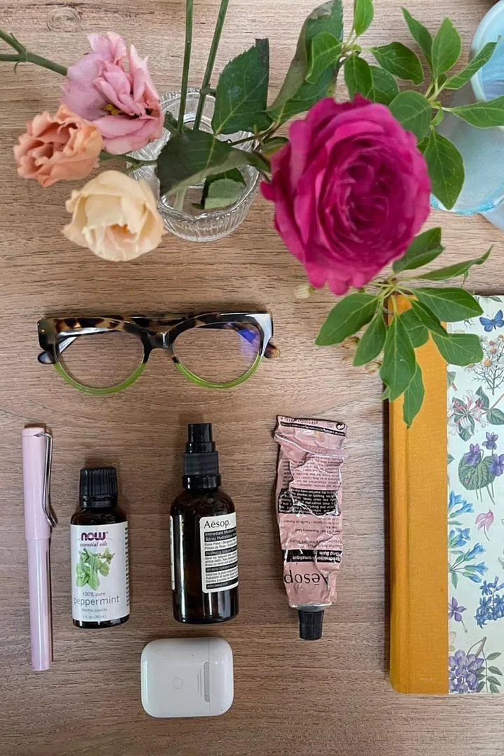 “A small vase of flowers of course. But aside from that, my bright bag of treats, which include Aesop facial spray and now essential oils.”