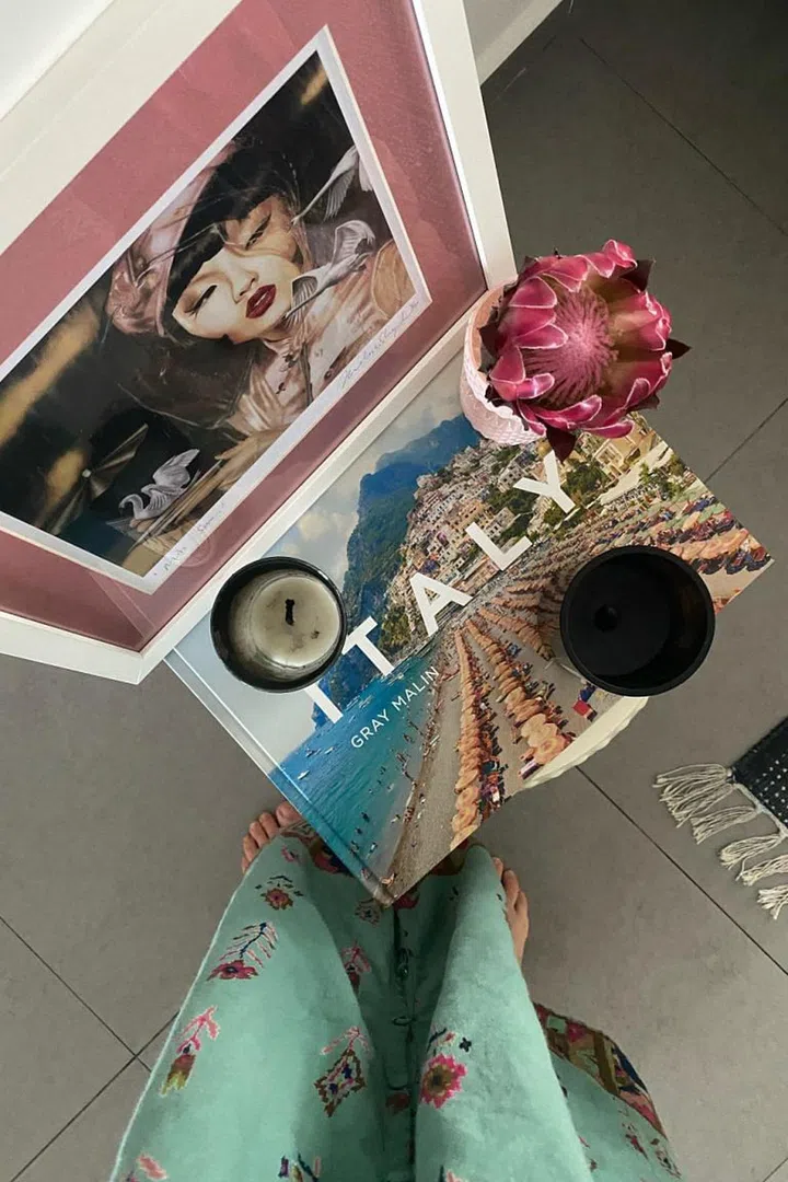 “I have moved in recently and my living room is my current office. The table is from an Italian designer. Here, I can find a balance of daylight, plants, flowers, books, art, peace, and functionality.”