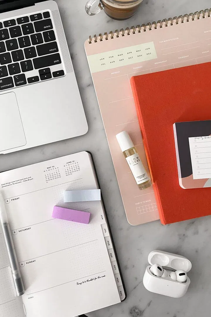 “Scent is very important to me so I’ll usually turn on my diffuser with peppermint-lemon scent to help me focus. And hydration is key! So I’ll make sure I have a bottle of water on my desk so I don’t have to keep getting up to rehydrate. Lastly, I need my to-do list, desk planners and notebooks to jot down ideas & notes, as well as keep track of my schedules and tasks.”