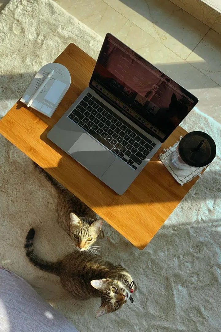 “Given that I’m renting a room at the moment, space is limited so my desk serves as both my work desk and vanity corner – which works out because I can get myself ready to look presentable at Zoom meetings. But sometimes when my cats are getting a little needy, I’ll move down to sit on the carpet so they can be beside me as I work.”