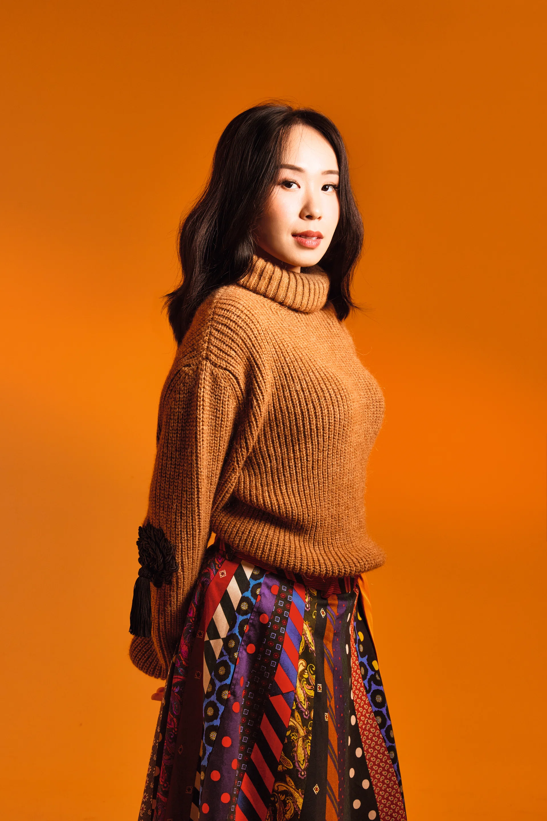 Outfit: Alpaca sweater and printed cotton skirt, Moschino
