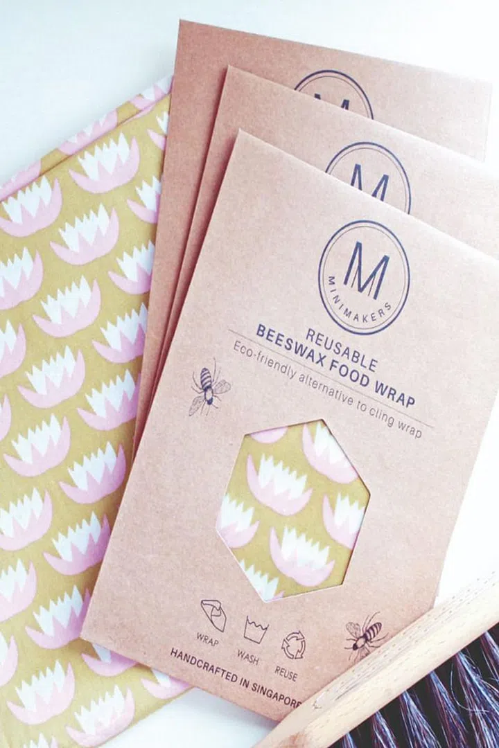 Play your part in reducing the use of plastics. Make the switch from singleuse plastic containers to reusable options, and cut down on cling wrap usage too. Instead, try Minimakers’ organic cotton beeswax wraps, which are washable, reusable and compostable. They are made locally with stylish designer fabrics.