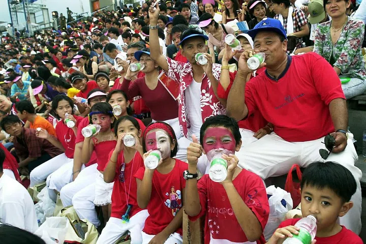A parade-goer and his family drinking the newly-released NEWater at the National Stadium.