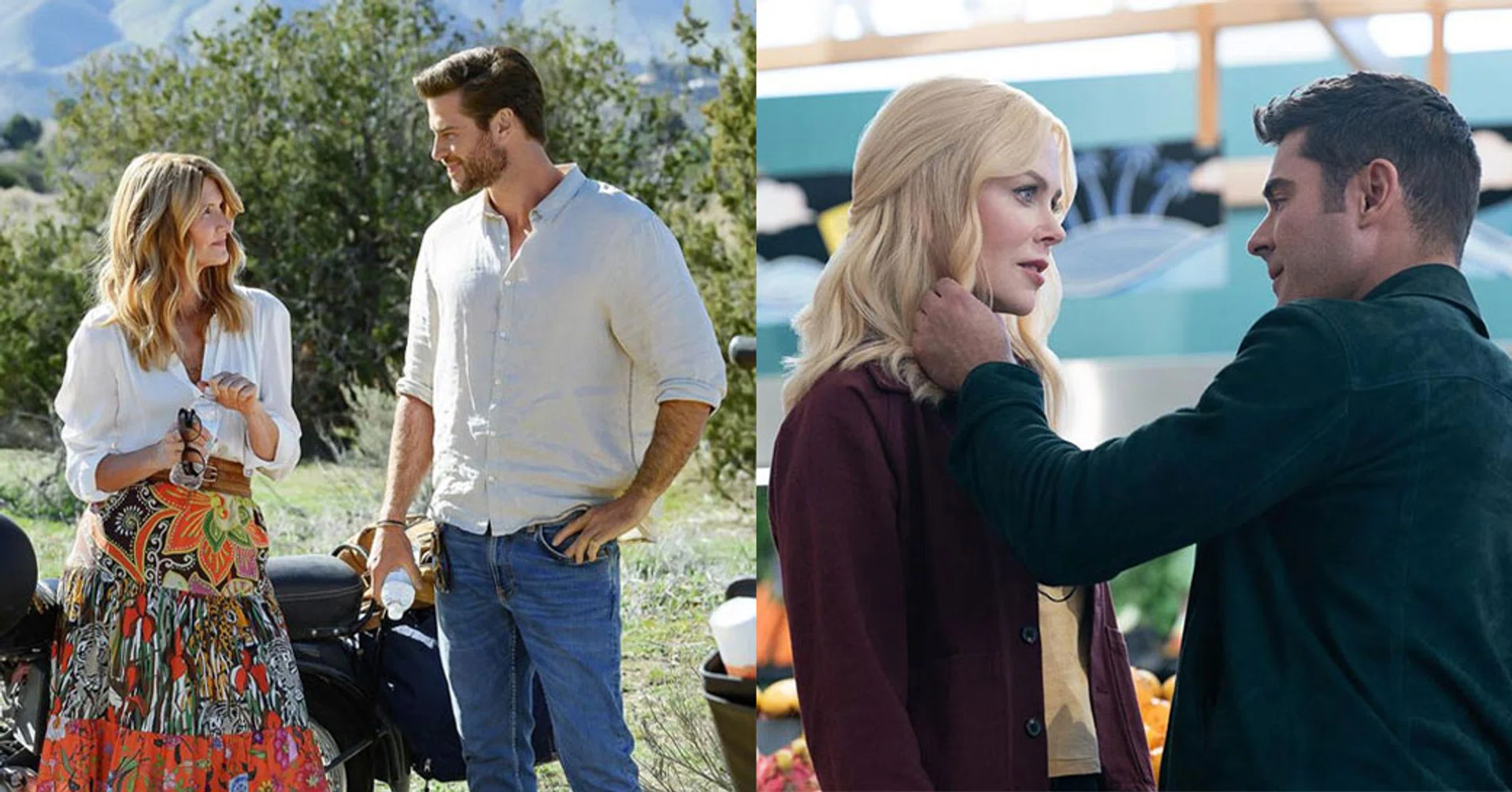 Sparks fly between Laura Dern’s 50-something author and a 30-something finance guy (Liam Hemsworth) in the Netflix drama Lonely Planet (2024).