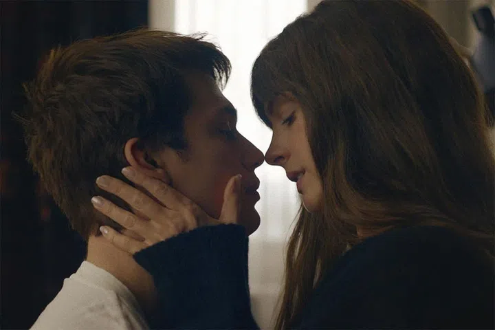 Hathaway murmurs “I’m old enough to be your mother” as her 30-year-old co-star goes in for a kiss, but the actress’ unlined visage says otherwise.