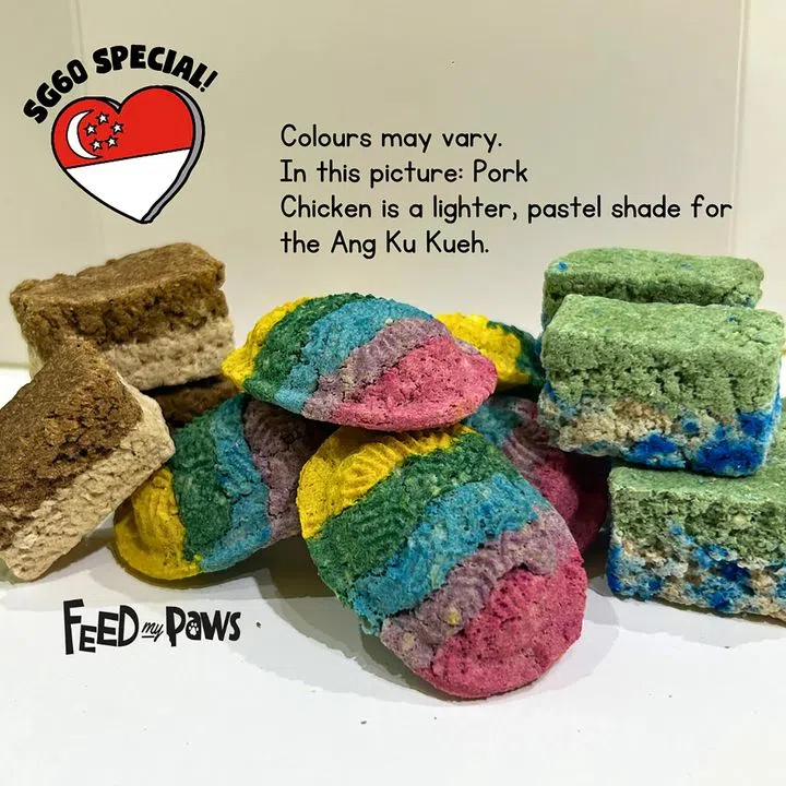Feed My Paws SG60 Specials’ colourful, freeze-dried “Nonya kueh” are made with pork or chicken and are suitable for cats and dogs.