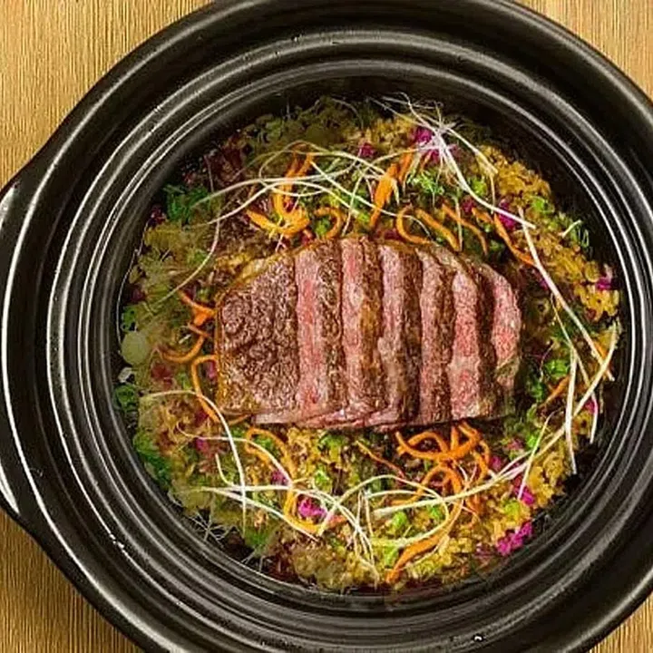Examples of donabe creations that Akane has served include minced Japanese wagyu, spiced up with Arima sansho. The rice from Nagano is cooked with konbu in Hokkaido water. Fried diced potatoes, minced Japanese wagyu, and finely diced carrots are mixed into the rice before serving, and topped with negi.