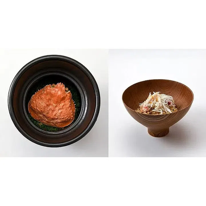 The chef changes the donabe ingredients based on the seasons. For his last winter menu (pictured), he prepared premium koshihikari rice in a crab stock made of konbu dashi, crab shell, carrots, celery and onions. The rice is topped with sweet, delicate Matsuba-gani (snow crabs) from Tottori prefecture, and a sprinkling of chives and yuzu zest. The donabe is covered with a crab shell and presented to guests before being portioned out into individual bowls. Winter white truffle shavings are available as a top-up option.