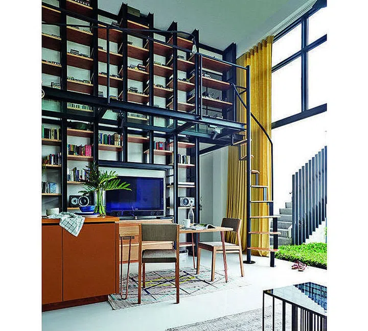 7. The dramatic double-volume ceiling of this apartment is emphasised by its floor-to-ceiling bookshelf made with metal and wood
