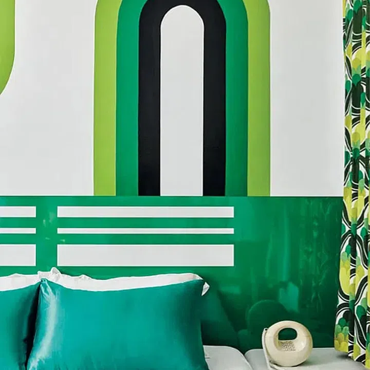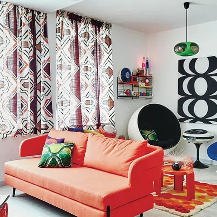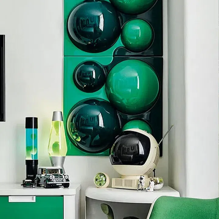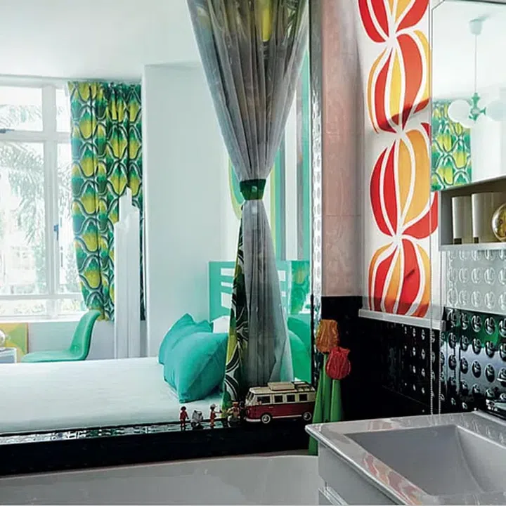 In a corner of the master bedroom, interlocking orb panels from famous Danish designer Verner Panton’s Visiona 2 art installation dress up the walls.