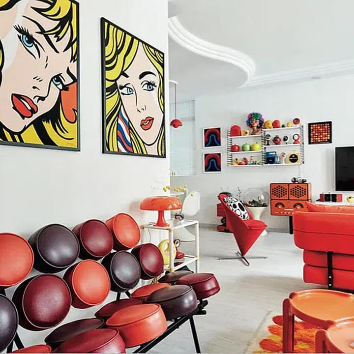 A Nelson Marshmallow sofa from Herman Miller in orange and red tones is a cheerful addition to the lounge area. Retro-pop art prints from Carousell complement the living room’s palette.