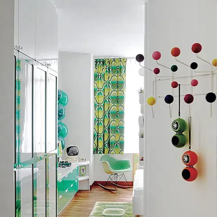 Vintage fabric bought from the Netherlands was made into a curtain for the master bedroom. Complementing the curves and spherical shapes of the home are these distinctive design classics – an Eames Rocker and Eames Hang-It-All clothes rack (both by Herman Miller).